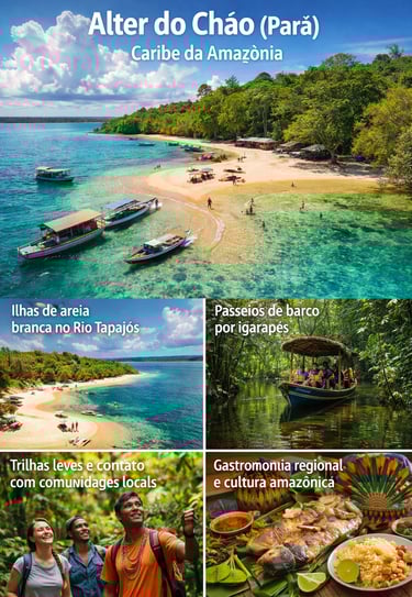 Conhecido como o Caribe da Amazônia, Alter do Chão combina praias de água doce, areia branca e a exuberância da floresta amazônica. É um destino perfeito para quem busca tranquilidade, paisagens exóticas e turismo de baixo impacto ambiental.